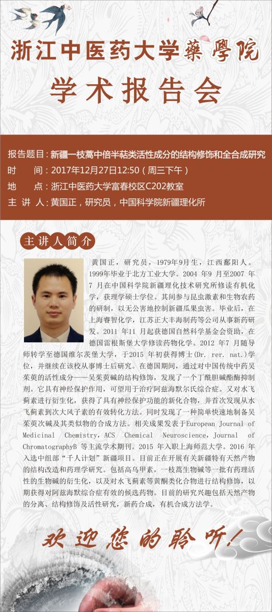 讲座预告:新疆一枝蒿中倍半萜类活性成分的结构修饰和全合成研究